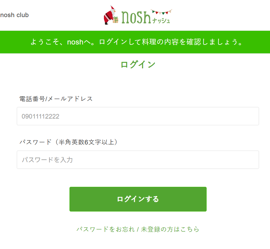 nosh(ナッシュ)のHPへ、画面右上のログインをクリックします。