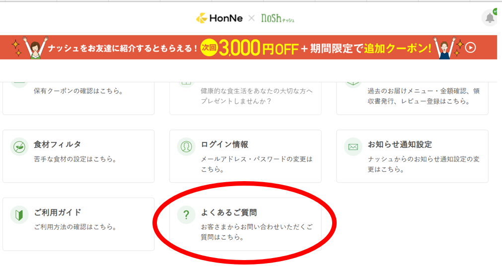 ナッシュの解約は、マイページの中の 「よくある質問(FAQ)」 の中にあります。