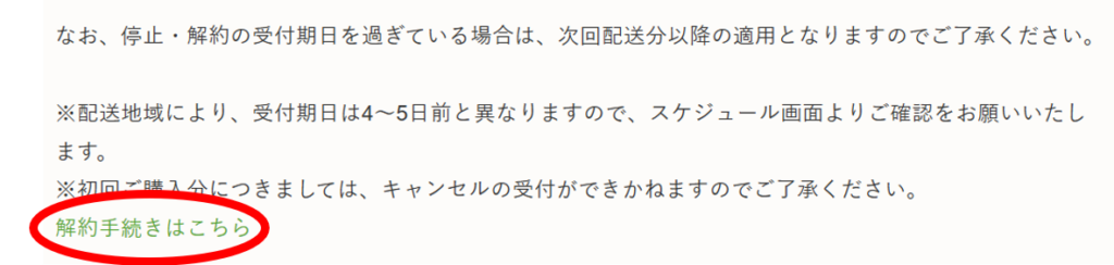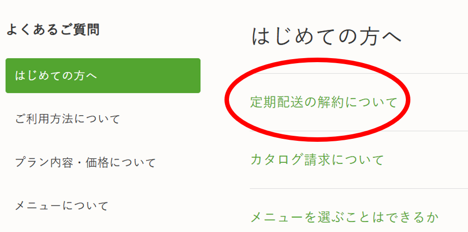 - はじめての方へ→「定期配送の解約について」 を選ぶ